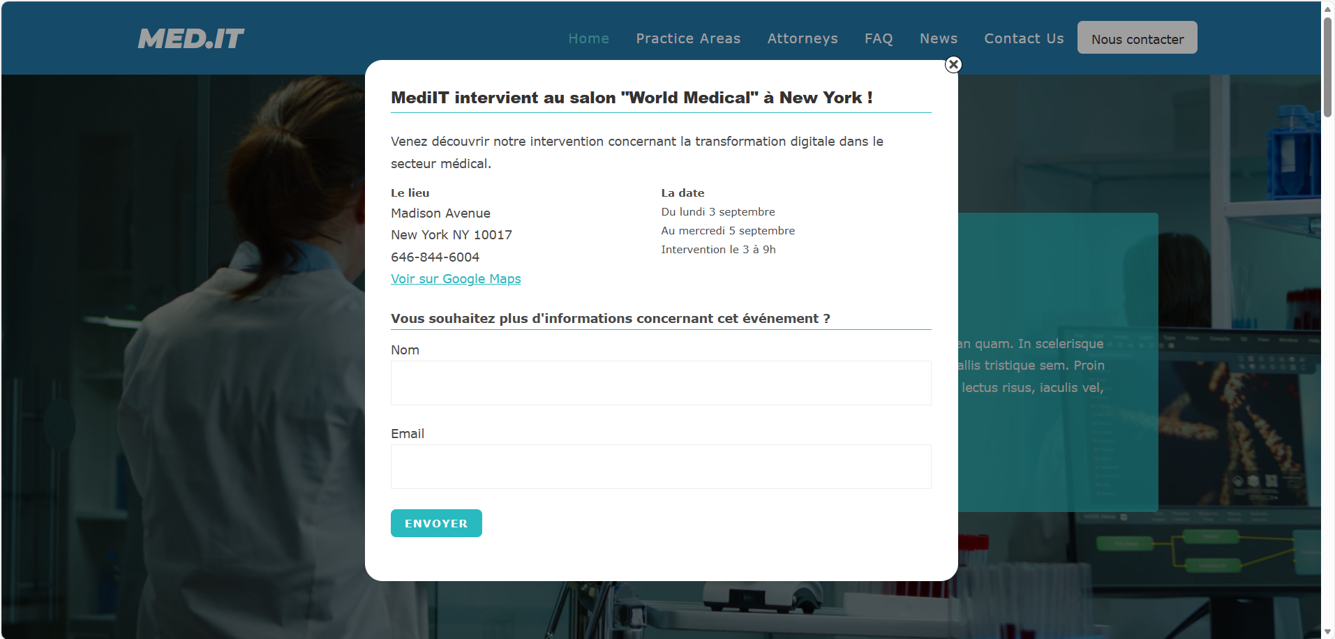 La PME MedIT, spécialisée dans les systèmes informatiques sur mesure pour le secteur médical, fait appel à moi en urgence pour réparer son site. À cette occasion, le responsable du marketing digital, a voulu mettre le site à jour. La liste des problèmes étaient les suivants: La modification de la page d’accueil avec Elementor ne fonctionnait plus (chargement infini). La popup qu'il a voulu mettre en place ne se fermait pas correctement. Le formulaire qui devait s’afficher dans la popup ne s’affichait pas. Le lien Google Maps dans le bloc “lieu” de la popup ne fonctionnait pas. Le bouton de contact dans le menu n’était pas positionné correctement. Pour réparer le site, j'ai cloné le site en local, remis le site en état de marche, préparé le cahier de recette, corrigé l'erreur d'édition Elementor, corrigé les 3 bugs de la modale et le positionnement du bouton de contact dans le menu, pour finir j'ai expliqué le principe des tests au responsable marketing.